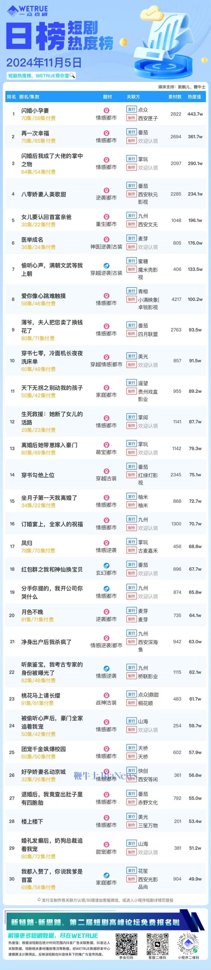 编者按:为帮助短剧从业者提供更多信息,专注于短剧报道的新腕儿和科技媒体鞭牛士联合WETRUE短剧热度榜共同推出短剧热度榜。