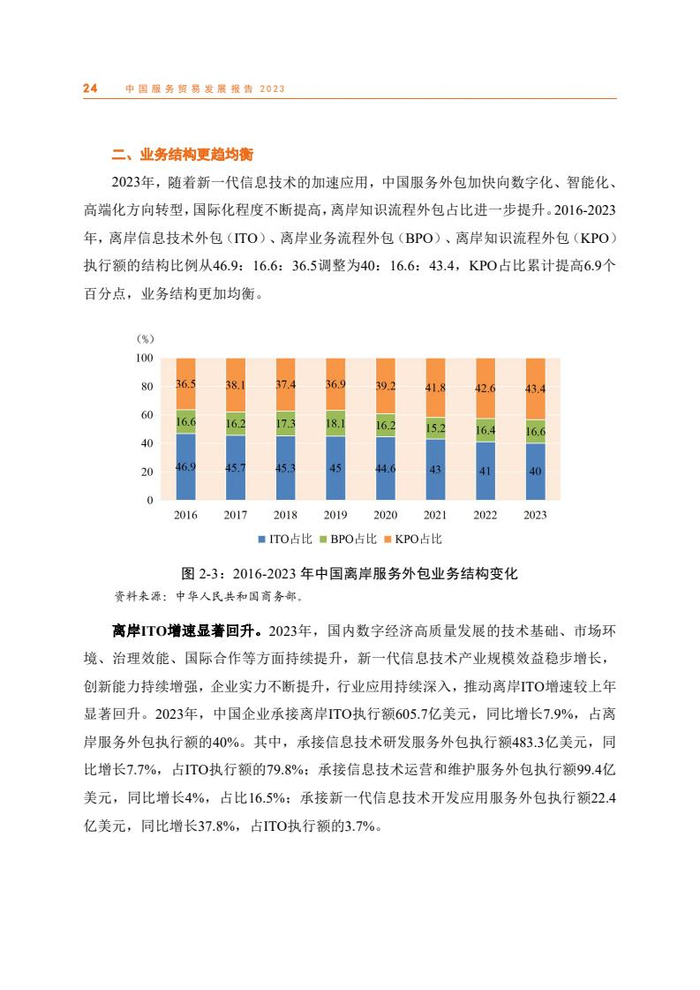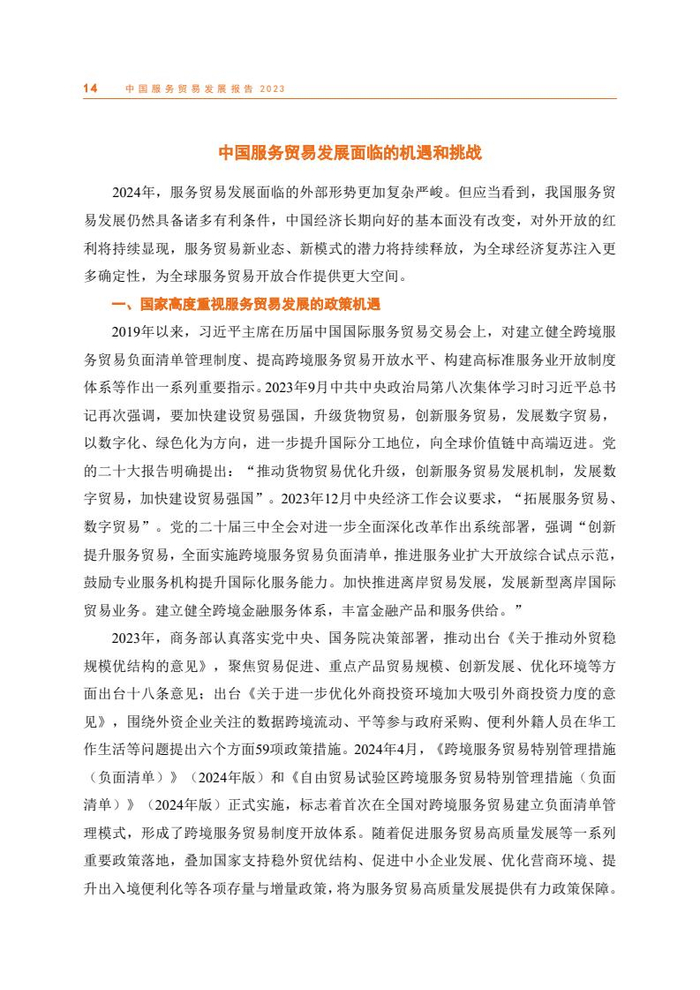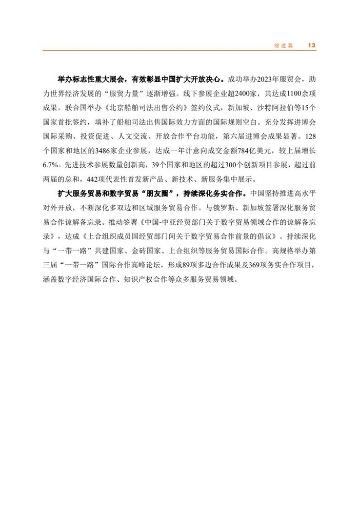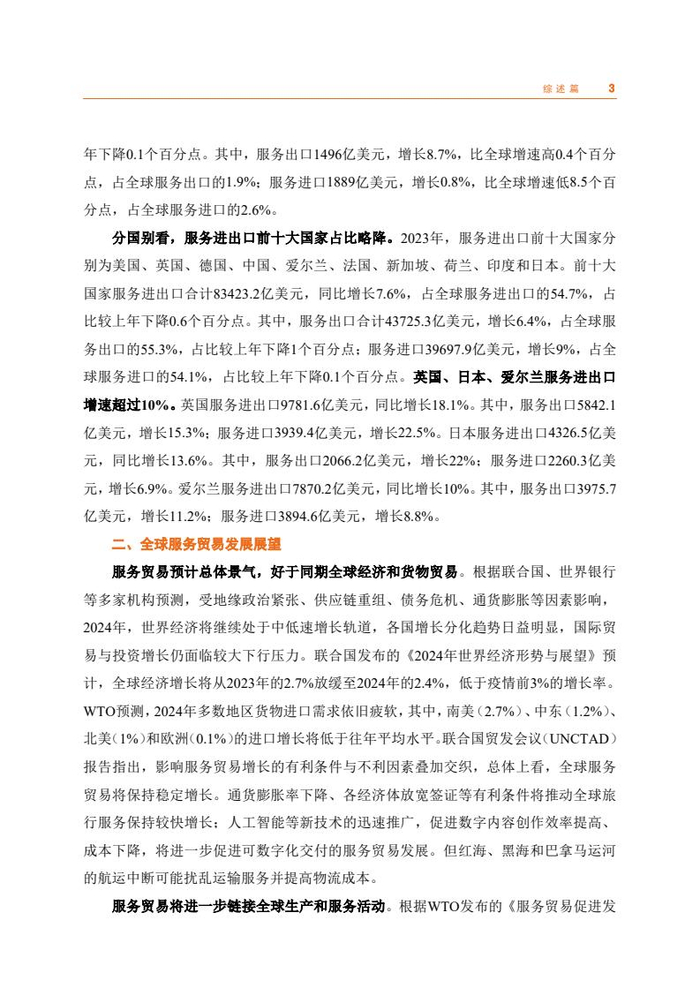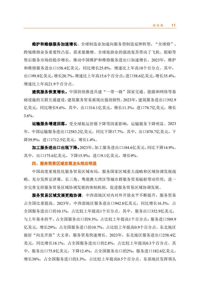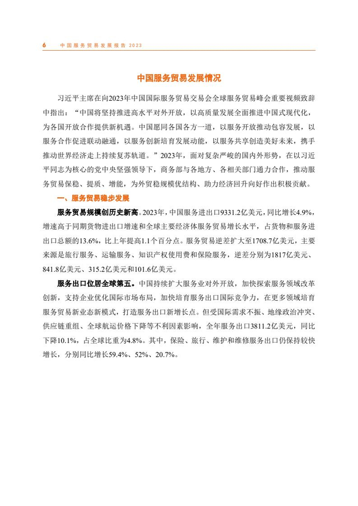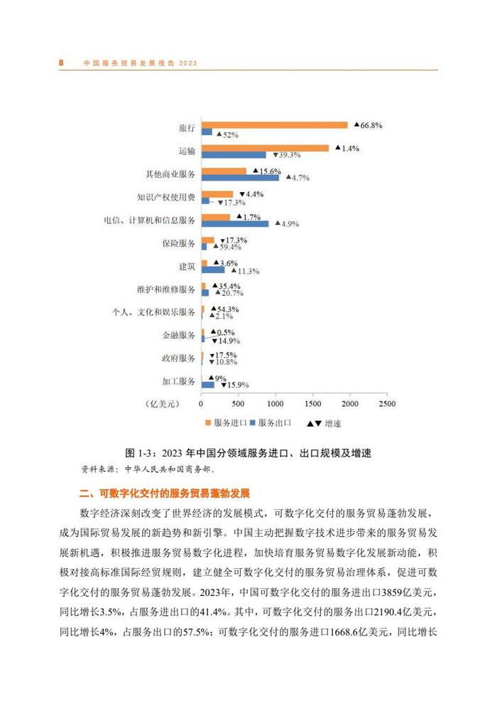 2023年,中国服务进出口9331.2亿美元,同比增长4.9%,增速高于同期货物进出口增速和全球主要经济体服务贸易增长水平,占货物和服务进出口总额的13.6%,比上年提高1.1个百分点。服务贸易逆差扩大至1708.7亿美元,主要来源是旅行服务、运输服务、知识产权使用费和保险服务,逆差分别为1817亿美元、841.8亿美元、315.2亿美元和101.6亿美元。