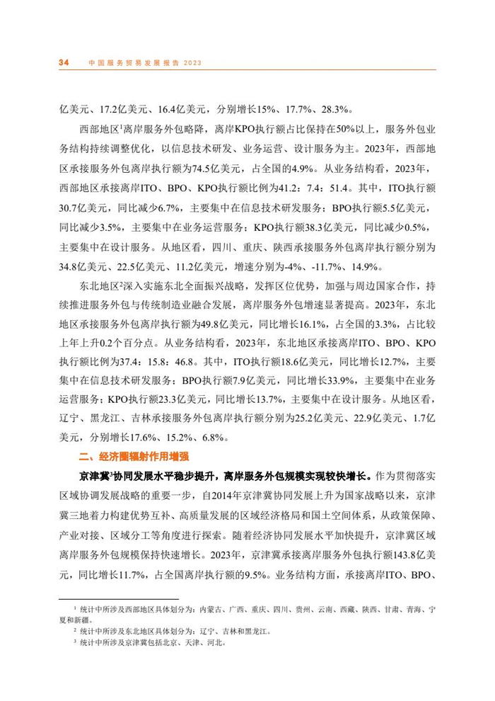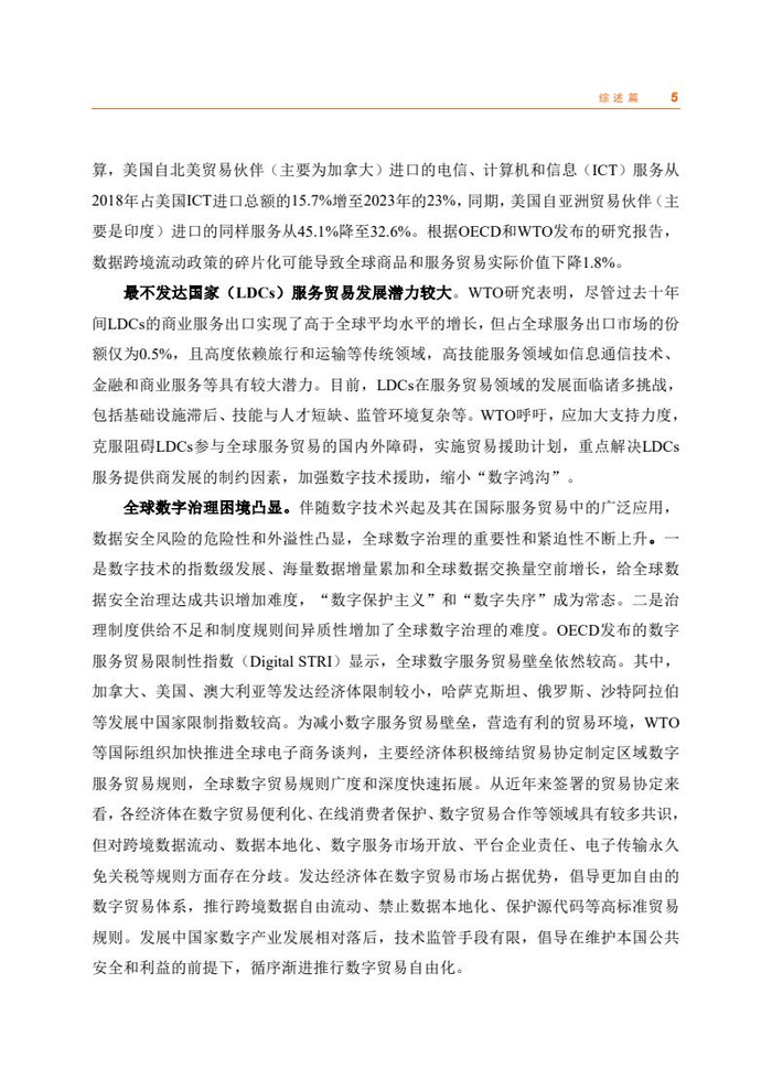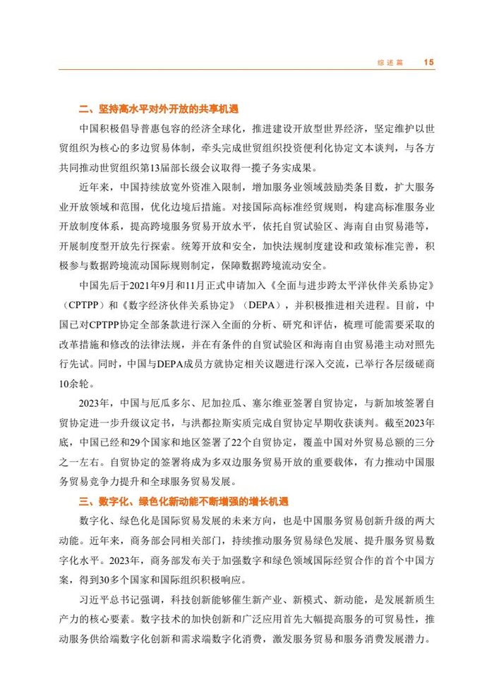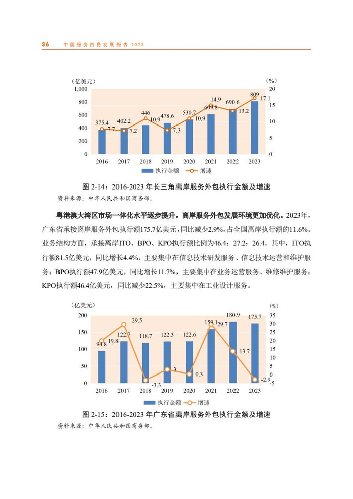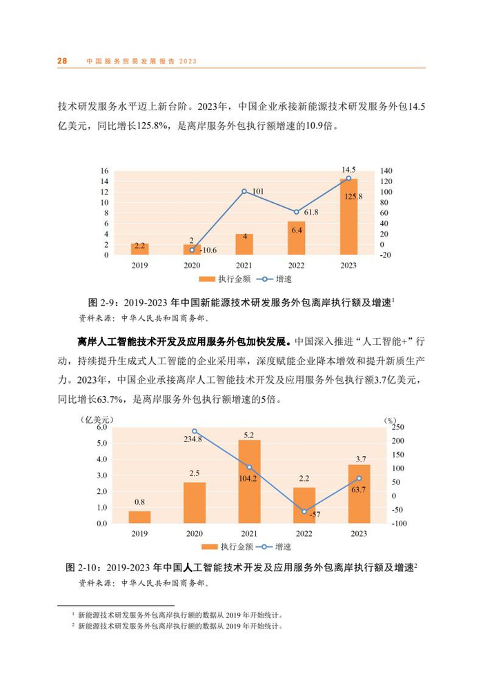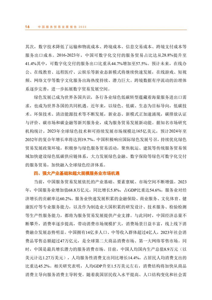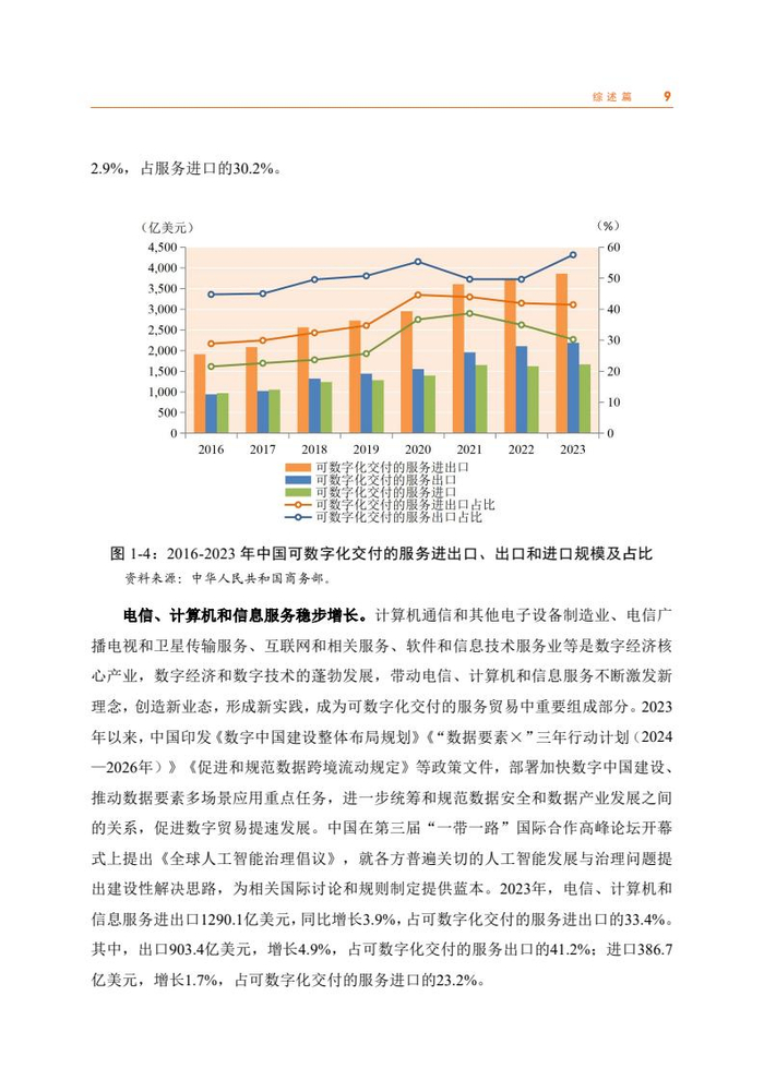 2023年,中国服务进出口9331.2亿美元,同比增长4.9%,增速高于同期货物进出口增速和全球主要经济体服务贸易增长水平,占货物和服务进出口总额的13.6%,比上年提高1.1个百分点。服务贸易逆差扩大至1708.7亿美元,主要来源是旅行服务、运输服务、知识产权使用费和保险服务,逆差分别为1817亿美元、841.8亿美元、315.2亿美元和101.6亿美元。