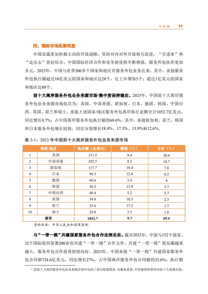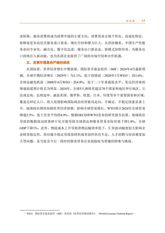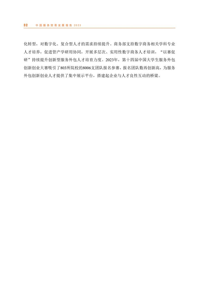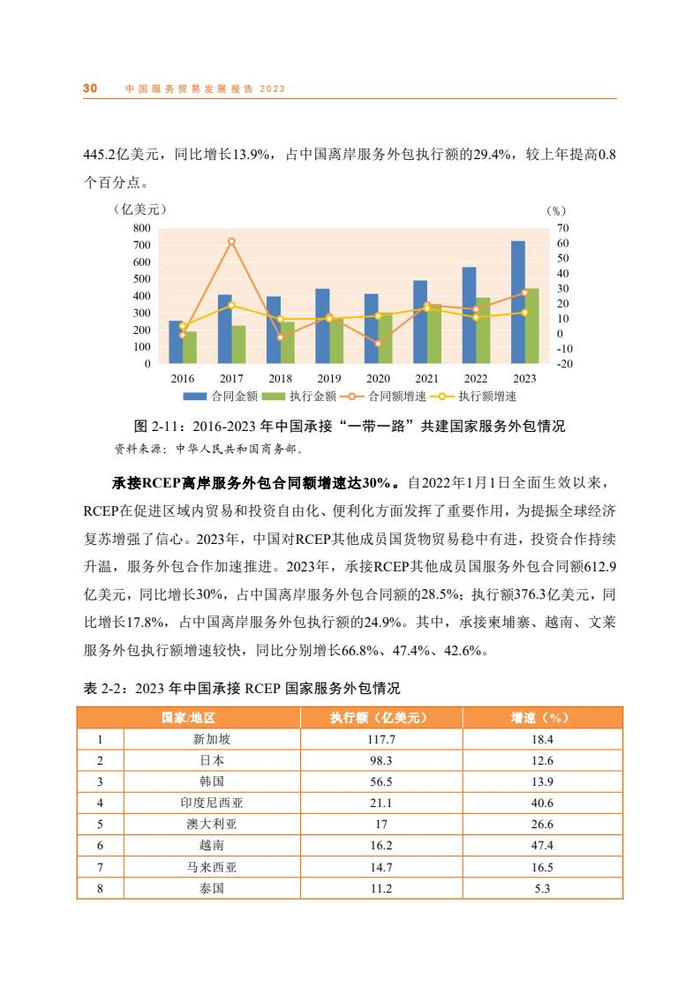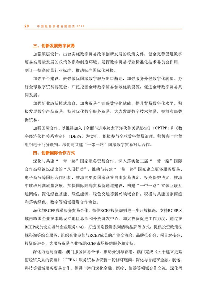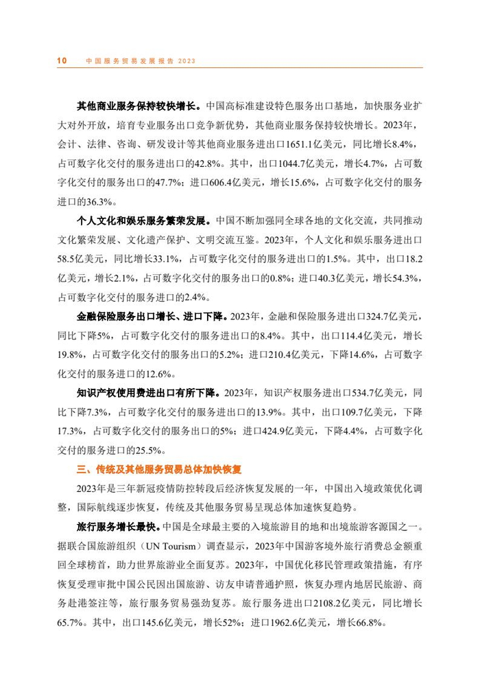 中国持续扩大服务业对外开放,加快探索服务领域改革创新,支持企业优化国际市场布局,加快培育服务出口国际竞争力,在更多领域培育服务贸易新业态新模式,打造服务出口新增长点。但受国际需求不振、地缘政冲突、供应链重组、全球航运价格下降等不利因素影响,全年服务出口3811.2亿美元,同比下降10.1%,占全球比重为4.8%。其中,保险、旅行、维护和维修服务出口仍保持较快增长,分别同比增长59.4%、52%、20.7%。