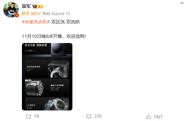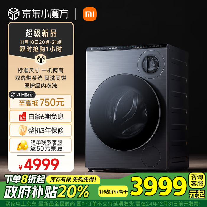 IT之家 11 月 10 日消息,小米雷军宣布米家双区洗双洗烘洗衣机将于 11 月 10 日晚 8 点开售,首发价 4999 元,如果当地有政府补贴甚至可以低于 3999 元。