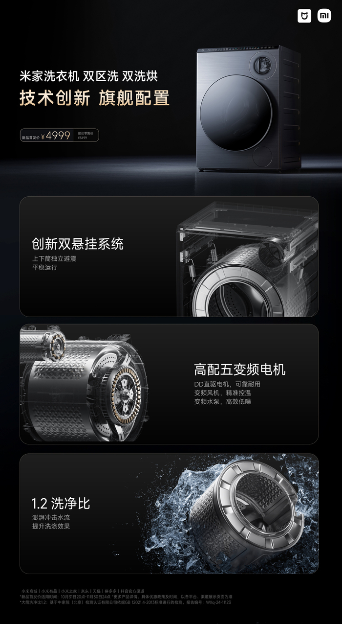 小米米家双区洗双洗烘洗衣机今晚开售:内衣、外衣分开洗,4999 元