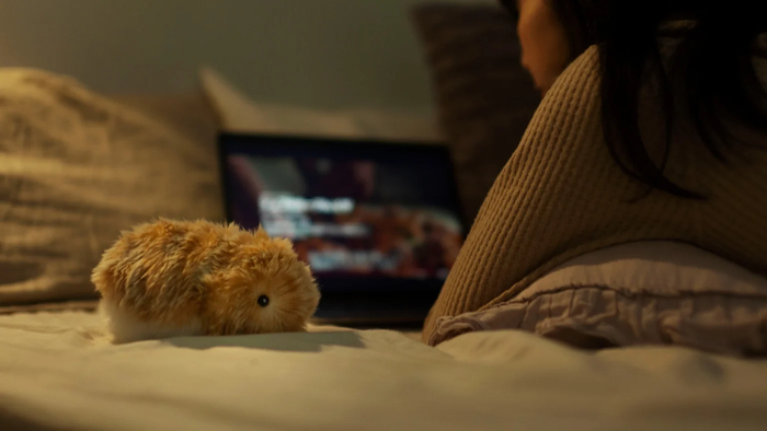 「Moflin有一颗像活物一样的心,是一个能让你振作起来的朋友」,Moflin全身被灰色或黄色的绒毛覆盖,看起来像豚鼠,又有点像兔子,只是没有竖起来的耳朵。