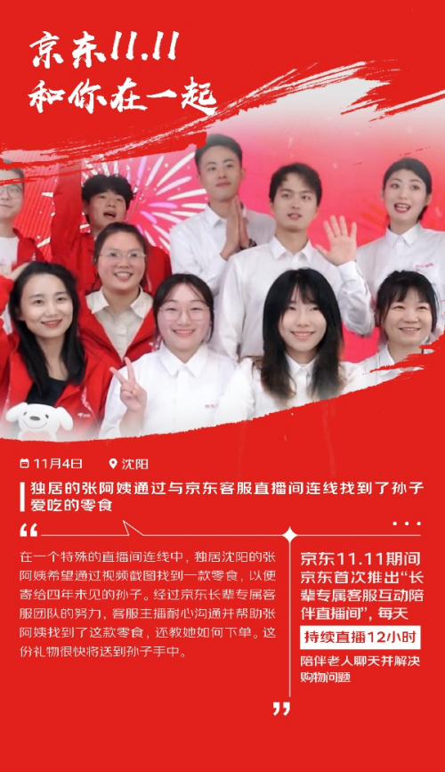 这个京东11.11,首次推出“长辈专属客服互动陪伴直播间”,每天持续直播12小时,陪伴老人聊天并解决购物问题。2021年初,京东成立“长辈专属客服团队”,为60周岁以上客户提供7*24小时服务,已帮助近千万老人。