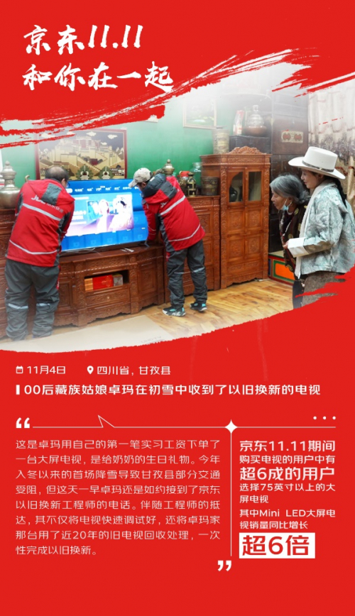 这个京东11.11,和卓玛家一样的以旧换新故事在天南海北发生。购买电视的用户中有超6成的用户选择75英寸以上的大屏电视,其中Mini LED大屏电视销量同比增长超6倍。包含省电空调、扫地机器人、烘干机、零水压智能马桶、功能沙发等在内的519个家电家居品类成交额同比增长超200%。