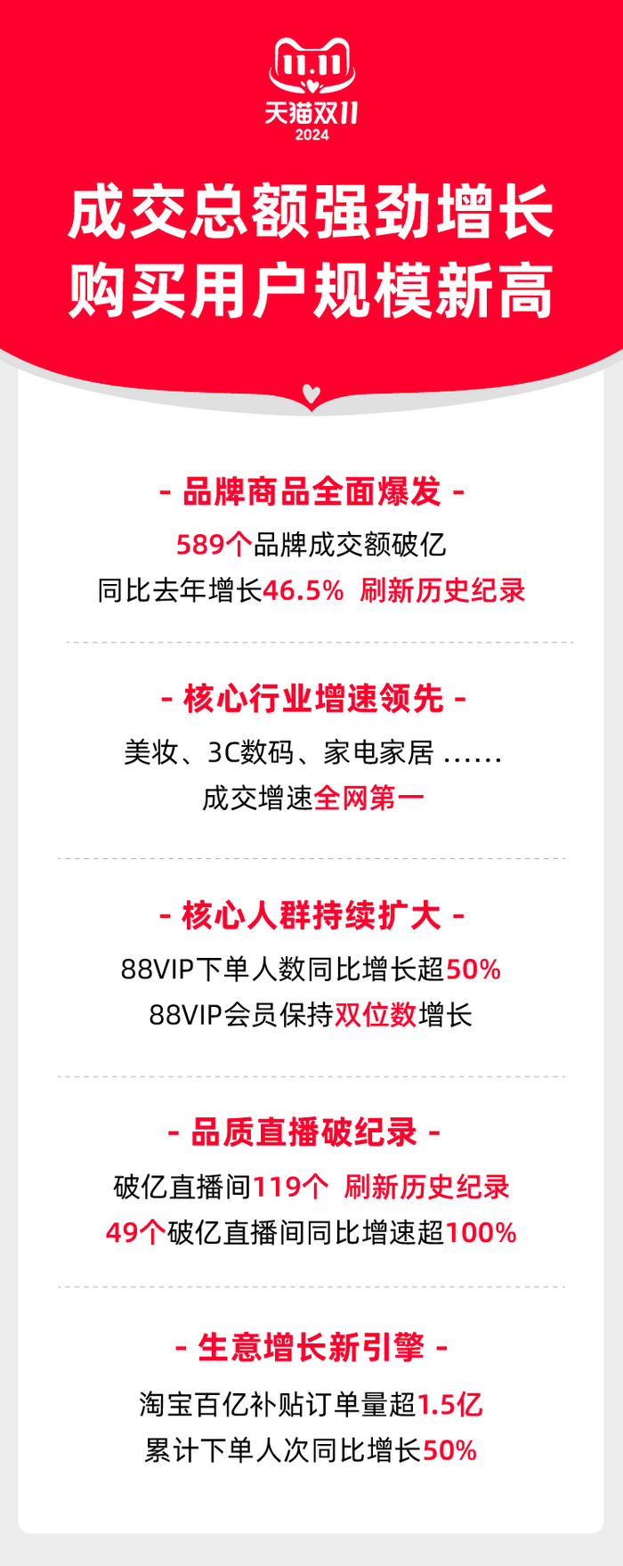 2024天猫双11战报:589个品牌成交额破亿,同比去年增长46.5%