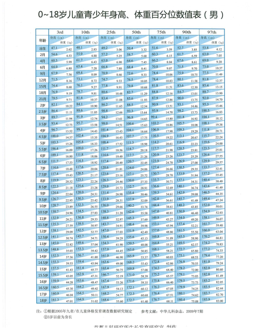 《全国0-18岁儿童青少年身高、体重百分位数值表(男/女)》,2005年版。(图/首都儿科研究所生长发育研究室)
