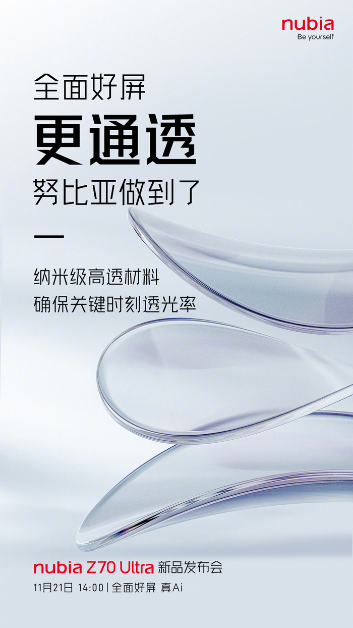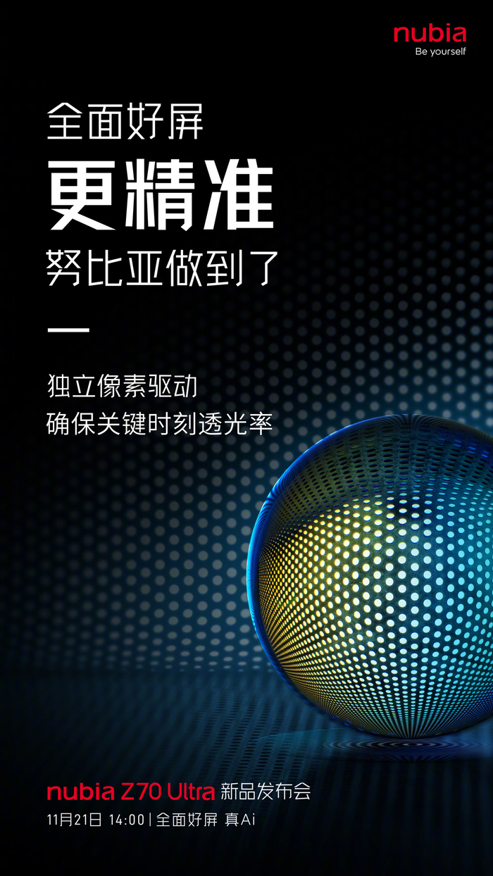 IT之家 11 月 14 日消息,努比亚 Z70 Ultra 手机今日官宣将于 11 月 21 日发布,新机将配备 6.85 英寸、95.3% 屏占比 1.5K 真全面无孔屏。