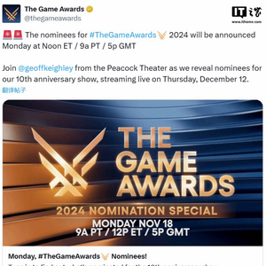 IT之家 11 月 15 日消息,TGA 创始人 Geoff Keighley 今日宣布,TGA 2024 提名名单将在 11 月 18 日公布,直播将于太平洋时间上午 9 点 / 东部时间中午 12 点 / 格林威治标准时间下午 5 点开始,对应的北京时间为 11 月 19 日凌晨 1 点。
