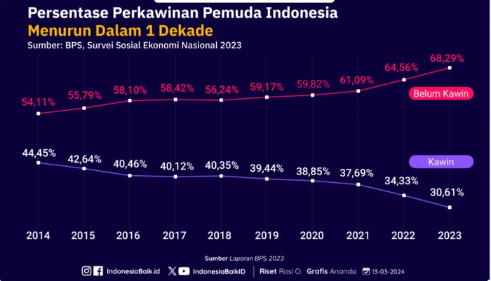 和韩国一样,印尼16岁到30岁的年轻人中单身人群也在增加,已婚人群占比在下降,从2014年的44.65%下降到2023年的30.61%。