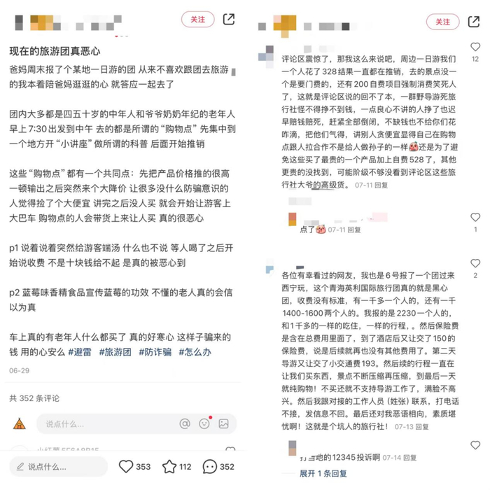 在网上分享了自己的奇葩经历过后,冯琪也看到了不少类似的吐槽:“我参加过35岁以上的老年团,我样子不像他们一开始还不让我进,好说歹说才让我坐最后,就这个团让我见识了什么叫有效推销,一开始是免费送赠品,后面陆续增加5元、10元、50元、100元……看我不买,我旁边的阿姨还给了我10元,让我以我的名义代她买,她觉得很值”“我陪我姨妈也去过2天低价旅游团,同样的听讲卖东西,我们把口袋扎紧了没买,但是同行的一个大爷花了1200元只得到了一口锅……”