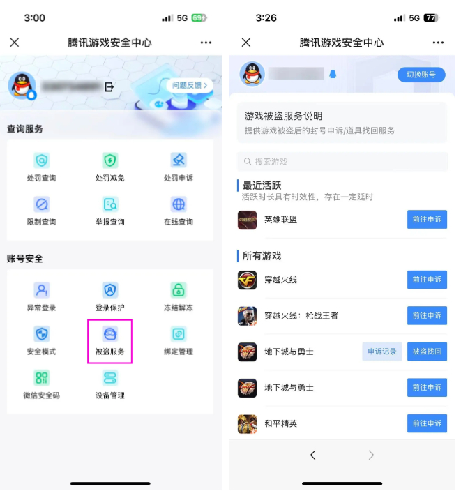 腾讯游戏安全中心微信公众号点击【自助服务】-【被盗服务】