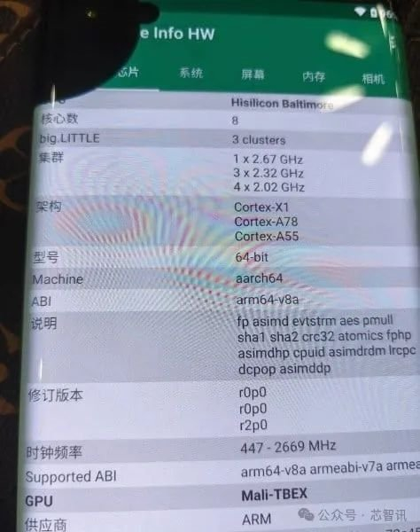 根据曝光的疑似Mate 70样机的硬件检测信息显示,CPU内核不再是定制的Taishan内核,而是采用Arm公版CPU IP,将包括1个主频2.67GHz Cortex-X1超大核,3个2.32GHz Cortex-A78大核和4个主频2.02GHz Cortex-A55能效核。