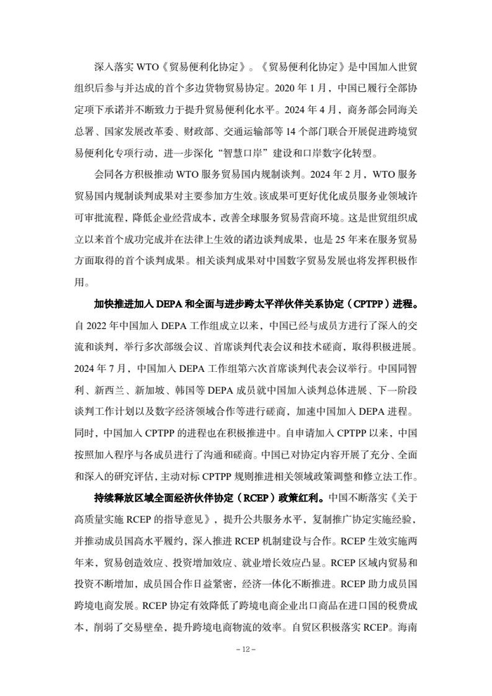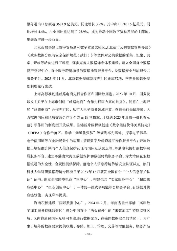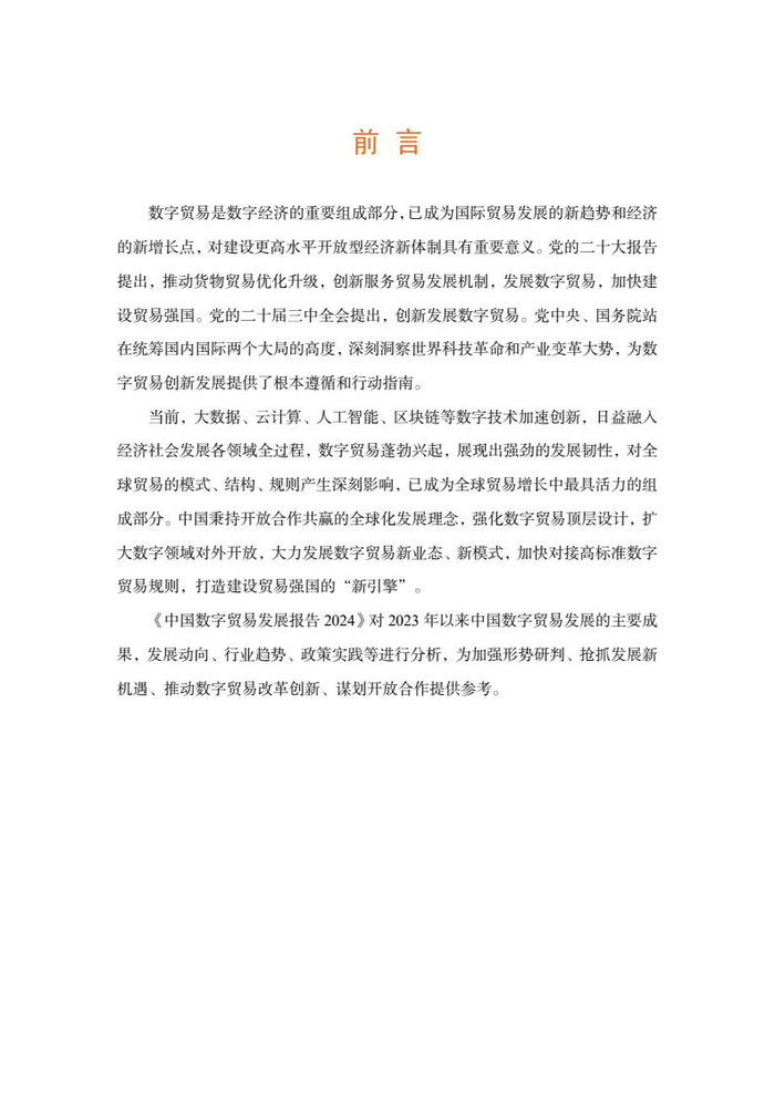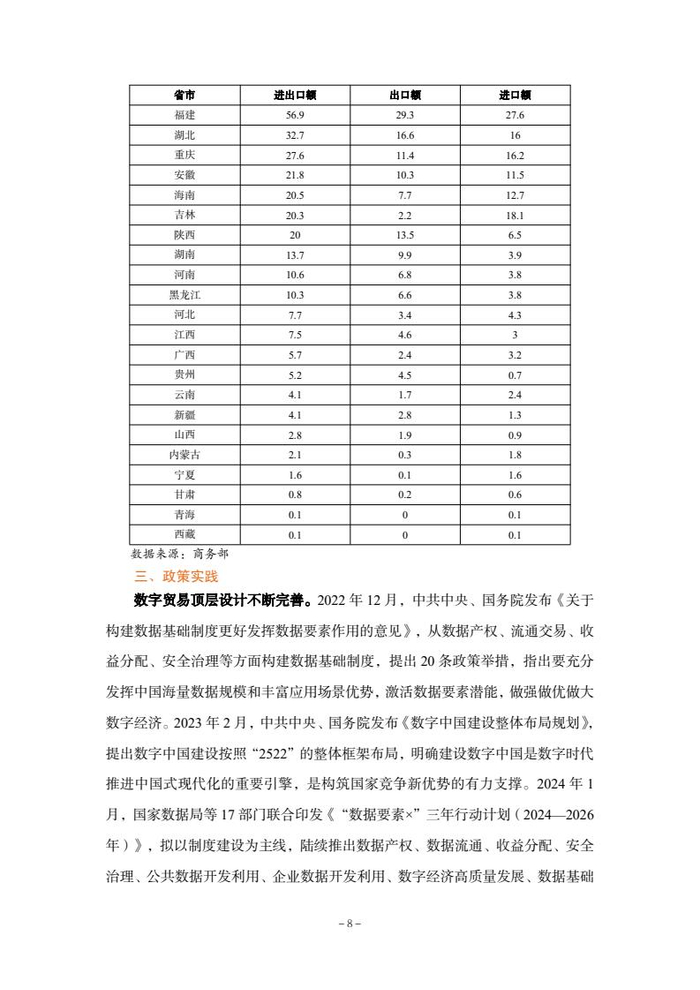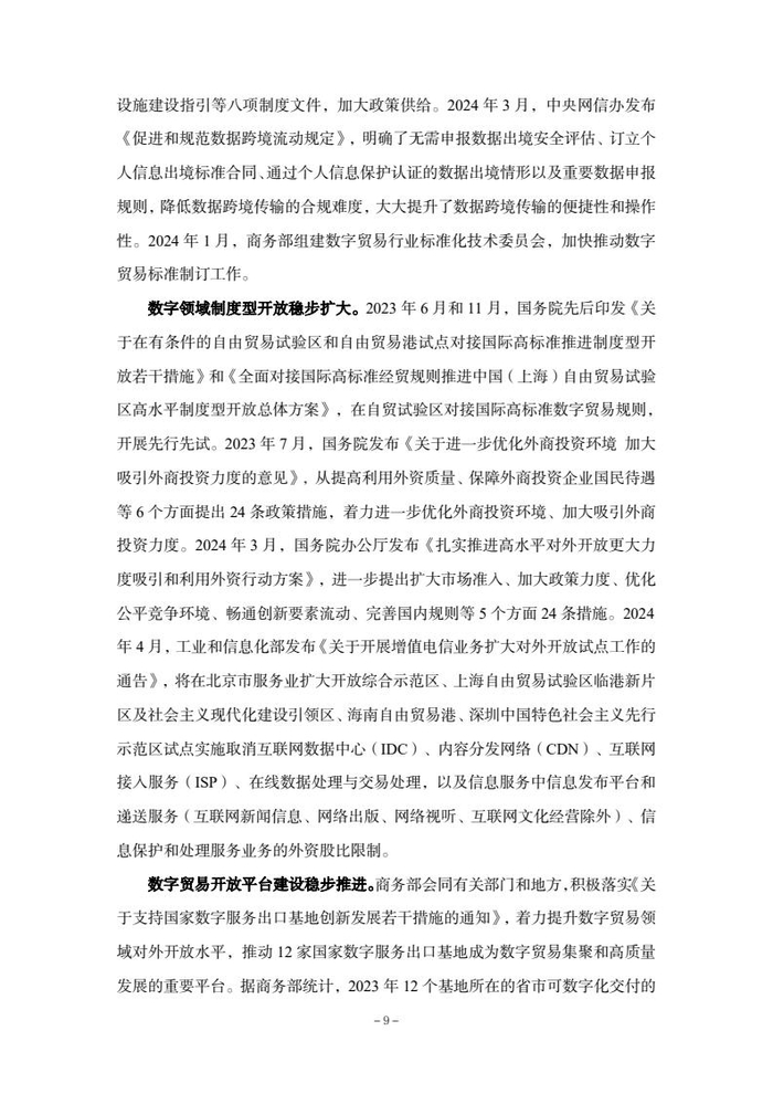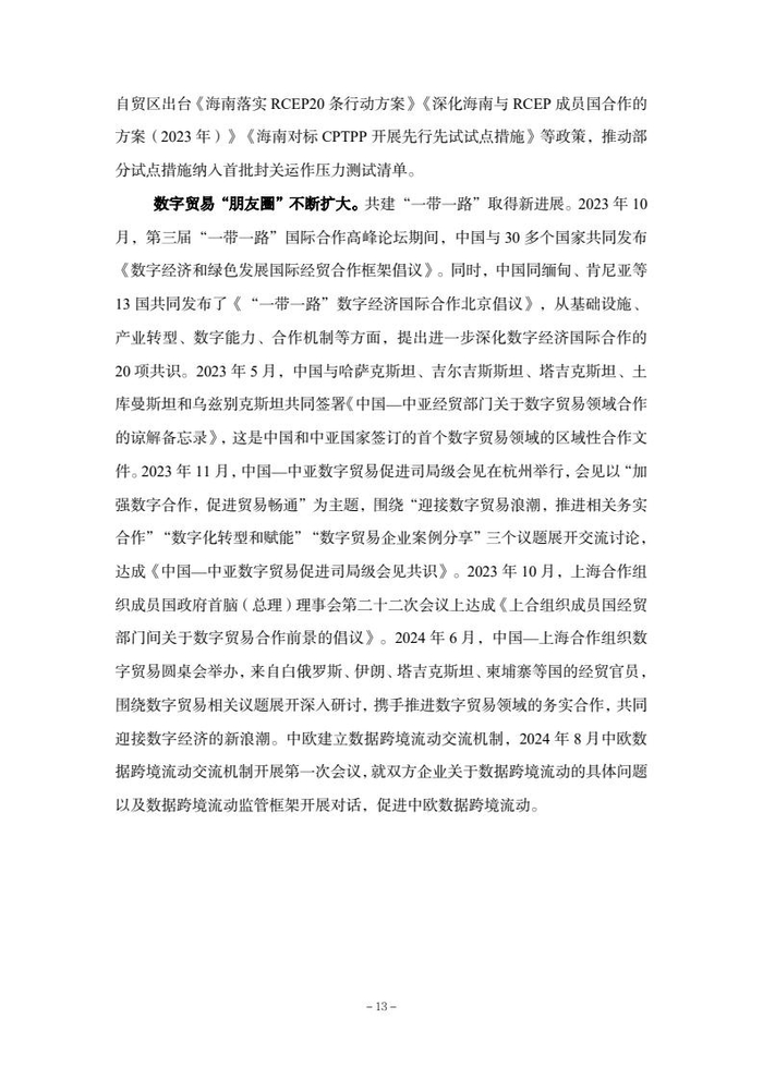 从进口看,2023年全球数字化交付服务进口排名前5位的经济体分别美国、 爱尔兰、德国、英国和荷兰,合计占全球比重达38.1%,中国是前10位经济体中唯一的发展中国家,排名第7位,全球占比4.4%。同时,发展中经济体数字贸易展现出巨大的发展潜力,增长提速,份额不断提升。2019—2023年,全球数字化交付服务出口前30大经济体中,发展中经济体占比由 13.2%升至 16.3%;全球数字化交付服务进口前30大经济体中,发展中经济体和新兴市场占比由 14.6%升至 16%。