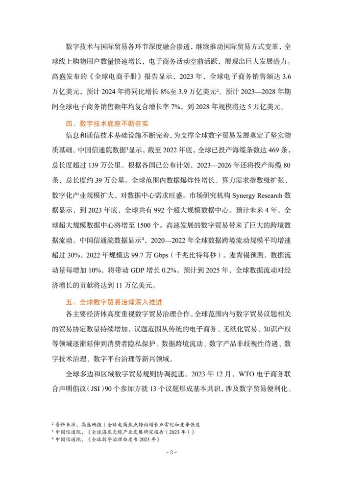 数字技术与国际贸易各环节深度融合渗透,继续推动国际贸易方式变革,全球线上购物用户数量快速增长,电子商务活动空前活跃,展现出巨大发展潜力。