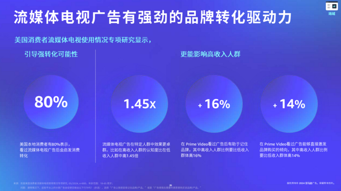 这是与传统认知有所不同的地方。《百舸争“流”——中国品牌出海流媒体电视营销白皮书》调研显示,美国有80%的本地消费者看过广告后会启发消费转化,尤其在高收入人群的认知度比低收入人群高1.45倍。