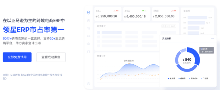 伴随着跨境电商行业的快速发展,领星在过去的一年也取得了一定的成绩。根据知名统计机构艾瑞咨询的统计,领星在以亚马逊为主的跨境电商 ERP 当中,市场占有率第一。值得一提的是,领星在 2024 年营收同比增长超过 85%,服务的跨境企业数量超过 60 万家。