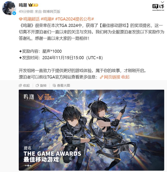 《鸣潮》获得 TGA 2024 最佳手游提名,全服发放 1000 星声奖励
