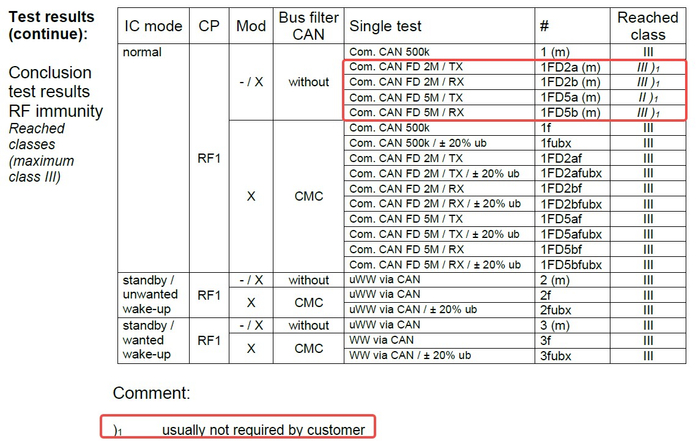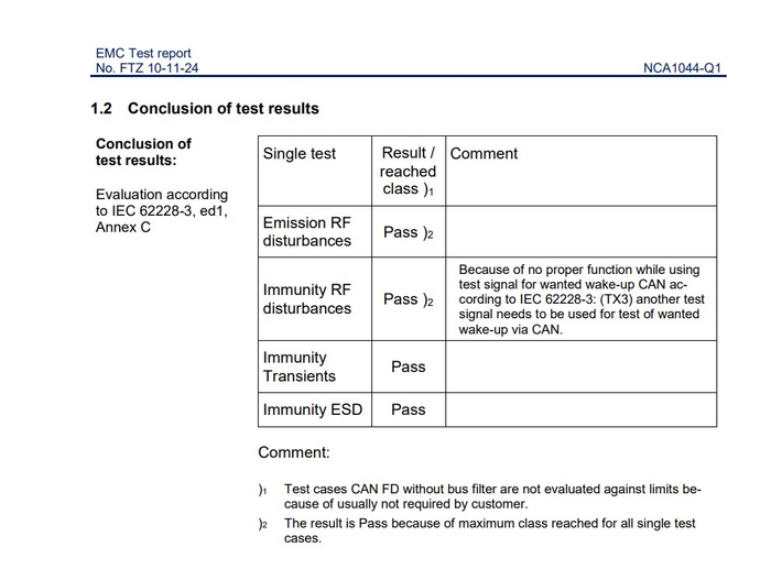 其中,IBEE/FTZ-Zwickau认证根据IEC62228-3标准进行,IEC62228-3相较于SAE J2962标准,排除了系统外围电路的影响,更聚焦CAN收发器本身的EMC特性,且要求等级更高,在除欧洲以外的车企中也得到了广泛参考应用。IBEE/FTZ-Zwickau认证包括:发射射频干扰(Emission RF Disturbances), 抗射频干扰(Immunity RF Disturbances),瞬变免疫力(Immunity Transients)和抗静电(Immunity ESD)共四项测试,纳芯微NCA1044-Q1全部通过。