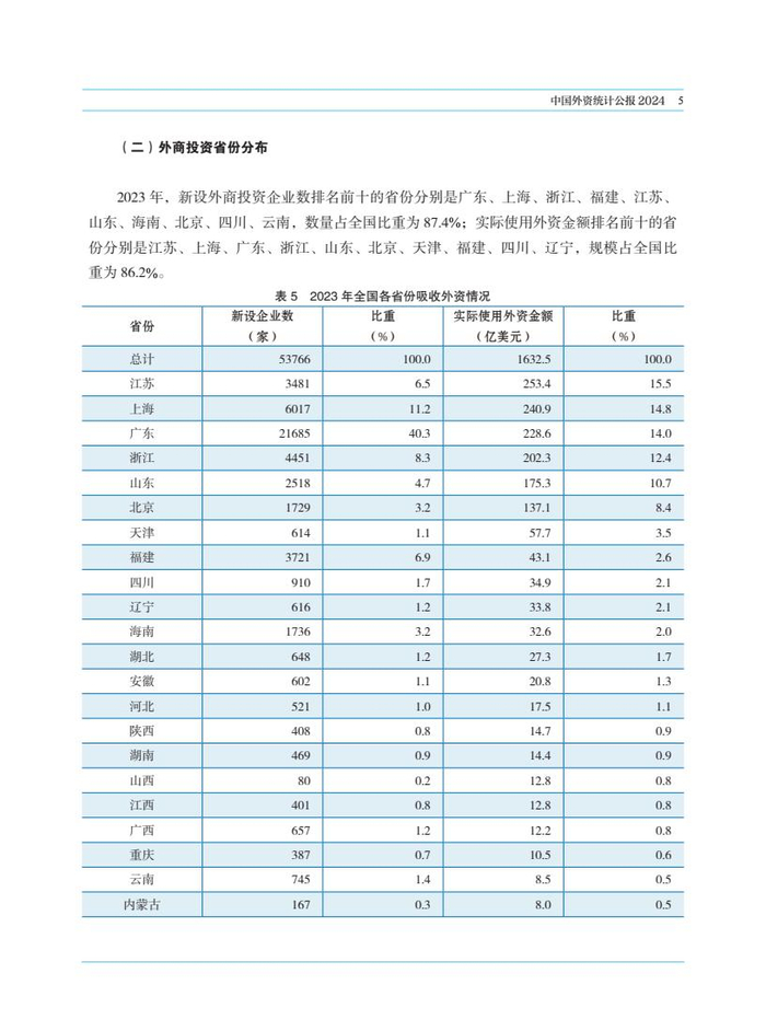 2023年,新设外商投资企业数排名前十的省份分别是广东、上海、浙江、福建、江苏、山东、海南、北京、四川、云南,数量占全国比重为87.4%;实际使用外资金额排名前十的省份分别是江苏、上海、广东、浙江、山东、北京、天津、福建、四川、辽宁,规模占全国比重为 86.2%。