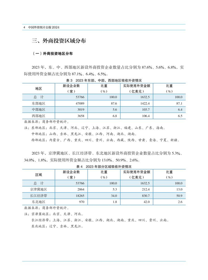 2023年,京津冀地区、长江经济带、东北地区新设外商投资企业数量占比分别为5.3%、34.0%、1.8%,实际使用外资金额占比分别力 13.0%、50.9%、2.6%。