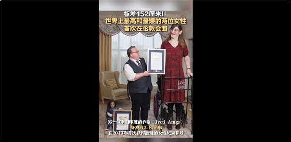 11月21日消息,吉尼斯世界纪录日之际,在伦敦总部,世界最高和最矮女性首次同框共进下午茶,两人身高差152厘米。