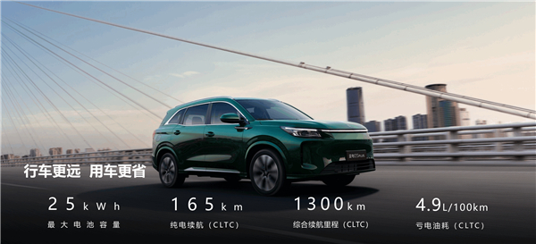 对于新能源家用SUV来说,动力、纯电续航和油耗都是不可忽视的卖点。蓝电E5 PLUS搭载了25kWh的大电池包,纯电续航165km,在10万级中型插混SUV中续航最长。