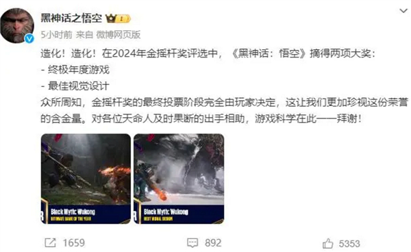 随后,官方回应称:“众所周知,金摇杆奖的最终投票阶段完全由玩家决定,这让我们更加珍视这份荣誉的含金量。对各位天命人及时果断的出手相助,游戏科学在此一一拜谢!”