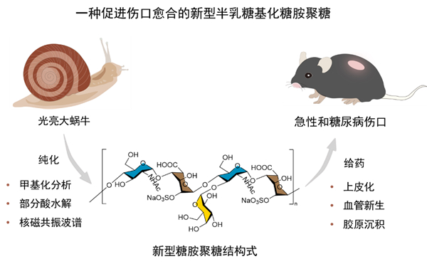 科研人员将其发现的新型糖胺聚糖应用于小鼠急性和糖尿病伤口模型,结果发现它可有效促进炎症改善、肉芽组织增生、血管新生和胶原沉积,从而加速伤口愈合,对比光亮大蜗牛和白玉蜗牛来源的糖胺聚糖,两者具有相似的主链结构,不同之处在于,前者具有半乳糖侧链而后者不带侧链,通过对促伤口愈合活性的对比,发现前者的效果优于后者,科学家推测,糖胺聚糖独特的侧链结构可能对活性具有增强作用。