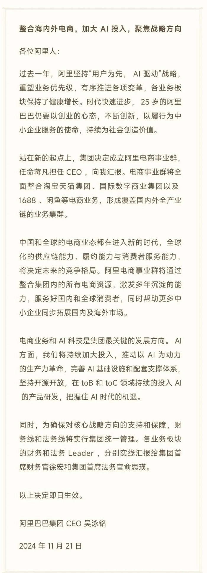 昨晚(11月21日傍晚),伴随阿里巴巴集团CEO吴泳铭发出一封全员邮件,阿里电商事业群宣告成立。