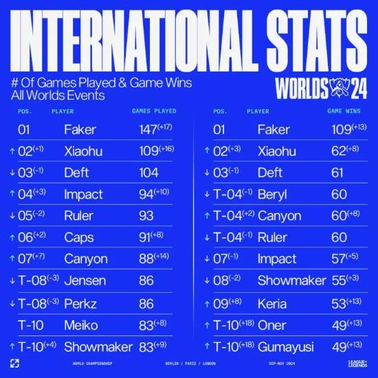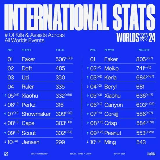 今日,《英雄联盟》官方公布S赛历史数据,包括历史击杀/助攻/出场/胜场榜(含今年数据),Faker无愧为大魔王,均位列第一。