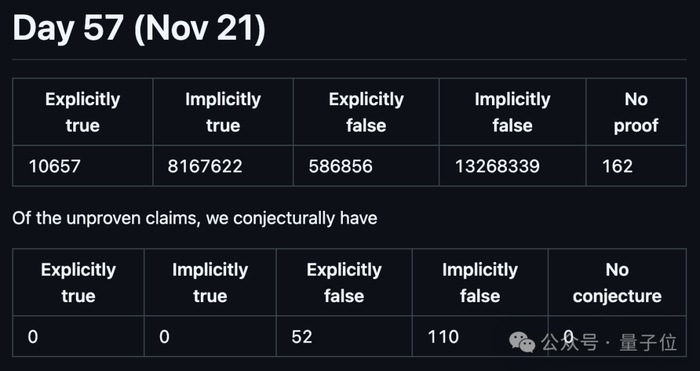 而现在,在 2200 万 + 个需要证明的蕴含关系中,8178279 个已被证实,13855193 个已被证伪,仅有 162 个还悬而未决。