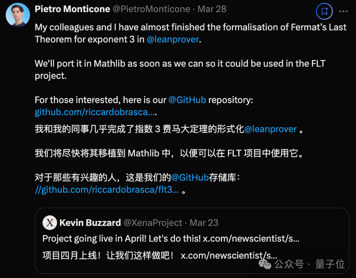 Pietro Monticone 还和他特伦托大学的同事们一起搞过指数 3 的费马大定理的 Lean 版证明。