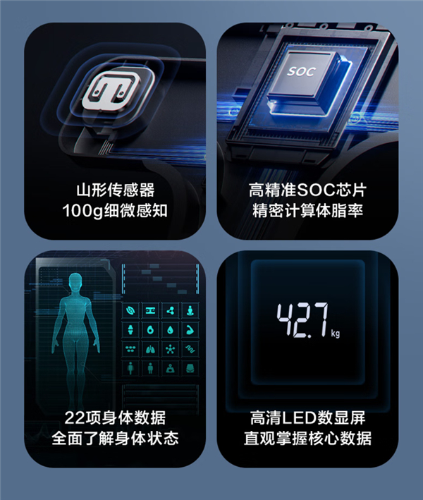 山形传感器,100g细微感知。高精准SOC芯片,精密计算体脂率。