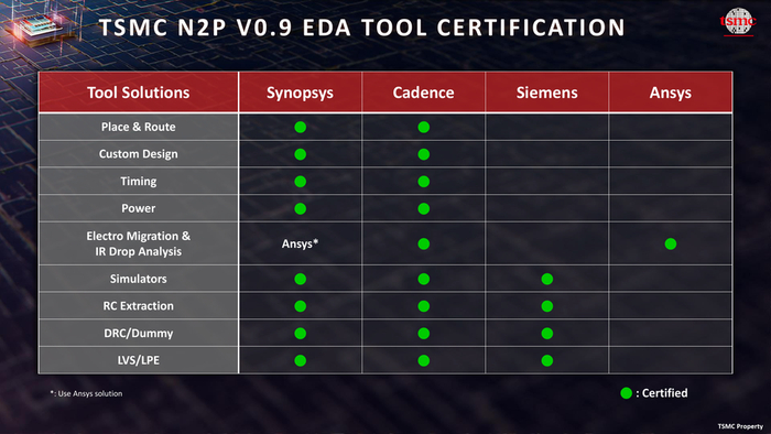 目前,Cadence 和 Synopsys 的所有主要工具以及 Siemens EDA 和 Ansys 的仿真和电迁移工具,都已为台积电的 N2P 制造工艺做好准备。这些程序已经通过 N2P 工艺开发套件(PDK)版本 0.9 的认证,由于该工艺预计将于 2026 年下半年投入大规模生产,因此该版本 PDK 被认为足够成熟。