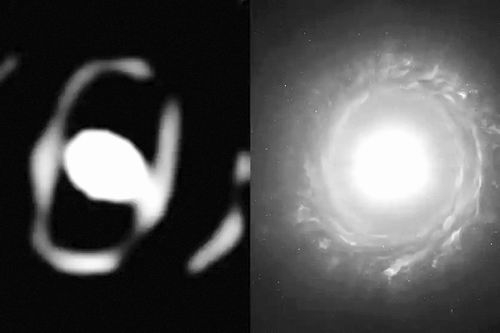 左为智利甚大望远镜干涉仪拍摄的恒星WOH G64,右为该恒星的艺术图。