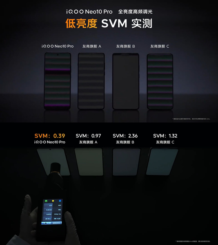 为了解决屏幕在80~90nit左右的频闪和亮度的“跳变”问题,iQOO行业首发Eye-care护眼屏幕电路设计,引入500多位行业专家,耗时400多天,基于全高频策略,联合SOC平台、屏幕驱动IC、屏幕面板厂商多方进行20多轮四方联调,为Neo10系列带来2592Hz全亮度高频调光,在不影响功耗、显示效果和寿命的情况下,实现屏幕全亮度<0.4SVM值,最低可达0.03SVM值的行业断层第一,达成行业最低频闪,还提供类DC调光与4320Hz超高频调光供用户自由选择,更搭载旗舰同款“悦目护眼”技术,挑战行业最强护眼体验。