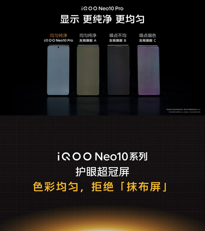 借助最新一代旗舰发光器件F1,Neo10系列搭载的护眼超冠屏带来行业第一梯队的1800nit全局激发亮度、行业更强低亮度画质、行业更强色偏控制、行业更强寿命色偏等7大堪称“行业冠军”的表现。同时,Neo10系列的屏幕校准产线与Demura设备对比上一代提升50%,每一台Neo10系列的屏幕都获得出厂逐屏校准,配合vivo自研De-mura2.0算法,实现行业最强低亮度均一性,拒绝「抹布屏」困扰。旗舰首发的vivo自研图层级色彩管理2.0算法,也助Neo10系列屏幕的色彩表现更为精准。