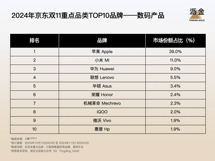 TOP10品牌榜中,苹果以39.0%的市占率强势领跑,但相较去年有0.7%的下滑。和去年相比,三星、一加掉榜,取而代之的是机械革命、iQOO。