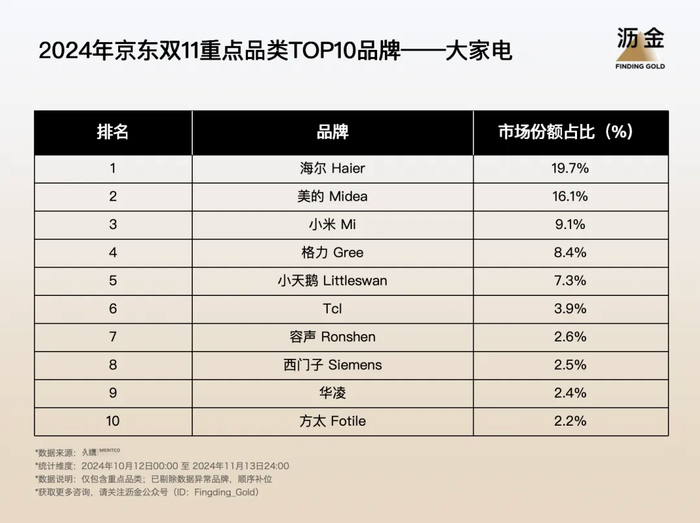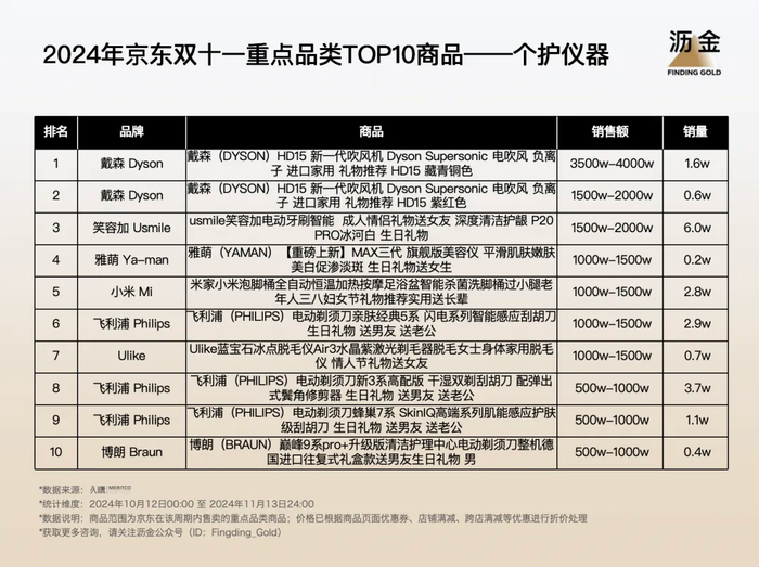 需要注意的是,本次只选择了京东具有代表性的13个重点类目品牌、商品榜单进行分析,且品牌表现和排名取决于品牌应对大促的策略,对于京东双11战绩仅有部分参考作用。