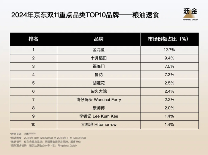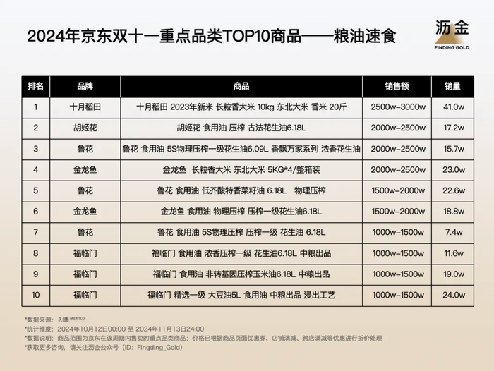 TOP10品牌榜中,前六名有4个食用油品牌,2个大米品牌,可见油、米是大促囤货首选。和去年相比,白象、多力、千禾掉榜,取而代之的是湾仔码头、李锦记、大希地。