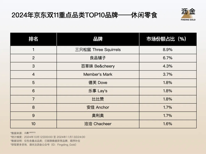 TOP10品牌榜中,三只松鼠、良品铺子、百草味三大零食巨头继续领跑,但市场份额均有所缩减。和去年相比,京东京造、科尔沁、沃隆掉榜,取而代之的是安佳、奥利奥、恰恰。