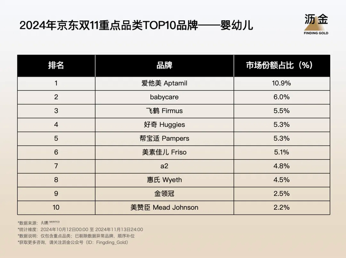 TOP10品牌榜中,爱他美蝉联冠军,市场份额进一步提高。值得注意的是,国货品牌仅占3席,为babycare、飞鹤、金领冠,说明海外品牌在京东婴幼儿市场仍占主导地位。和去年相比,雀巢掉榜,取而代之的是金领冠。