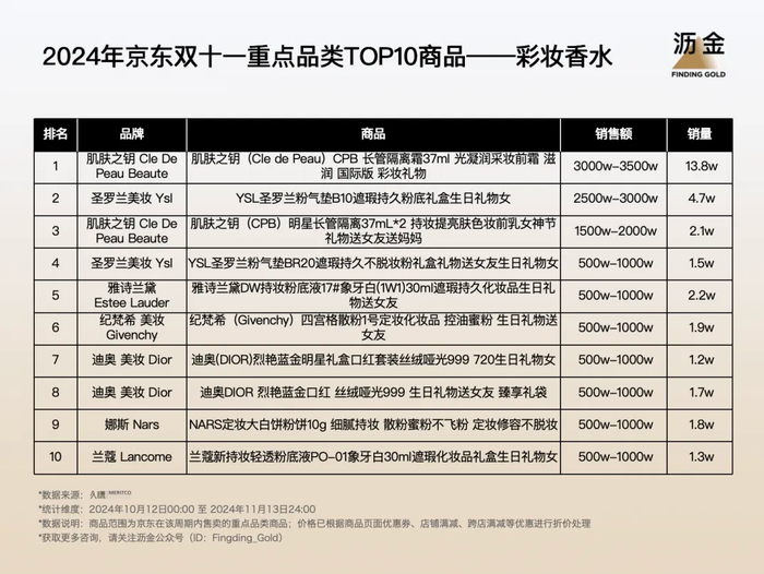 TOP10商品榜也被海外大牌产品占领。CPB长管隔离拿下第一和第三名,销售额和销量均遥遥领先;YSL粉气垫拿下第二名。