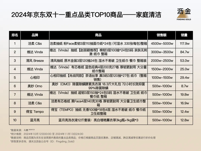 TOP10商品榜中,纸品占八成,大容量洗衣液占两成,家清产品作为生活必需品,消费者对其价格有较高敏感度,大促节点的囤货属性更为明显。