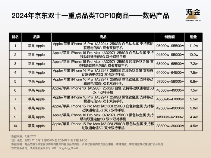 TOP10商品榜是iPhone手机的天下。就榜单来看,白色、沙漠色手机更受欢迎。
