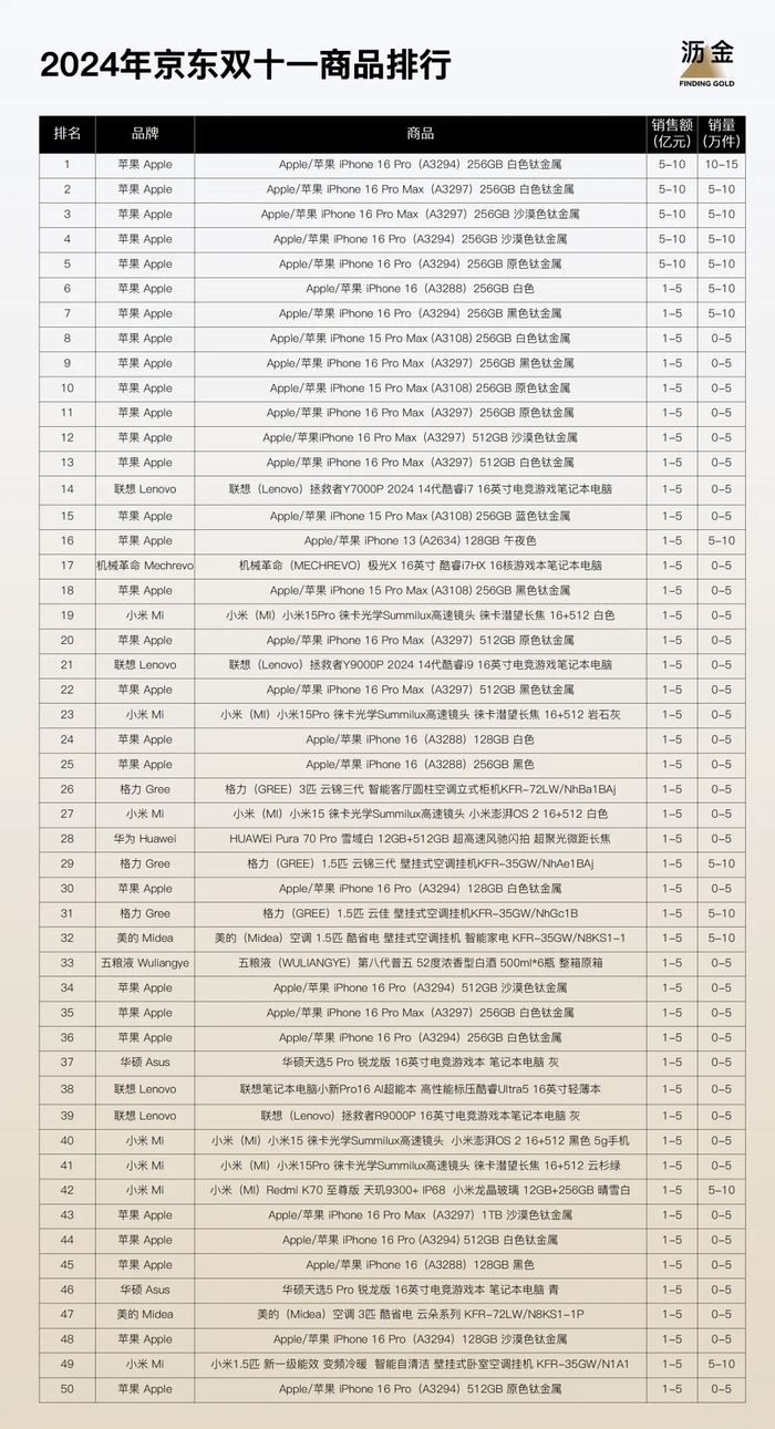 榜单前50几乎全被数码产品占据,其中,苹果独占29席,iPhone16系列赢麻了;上榜的电脑类产品有7款,均为游戏本。