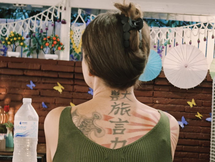 外国背包客和背后中文纹身