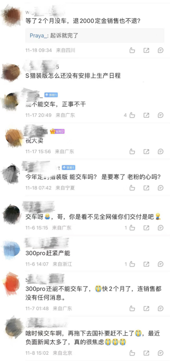 10月29日,有消费者表示,“去年购买的哪吒S当然然后用的老婆账号购买的,我这边取消了。9月1号下定的哪吒S猎装,官方给出的答复也是30-60天提车,所以我等到了60天,但是目前我并没有接到哪吒任何提车的信息,我当支付了定金起,我们的合同就已经生效,如果哪吒方违约,请支付违约金和道歉。”