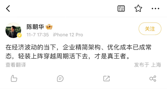 哪吒汽车副总裁陈朝华在当天下午发微博表示,“在经济波动的当下,企业精简架构、优化成本已成常态,轻装上阵穿越周期活下去,才是真王者”,不知道是不是对传言的回应。